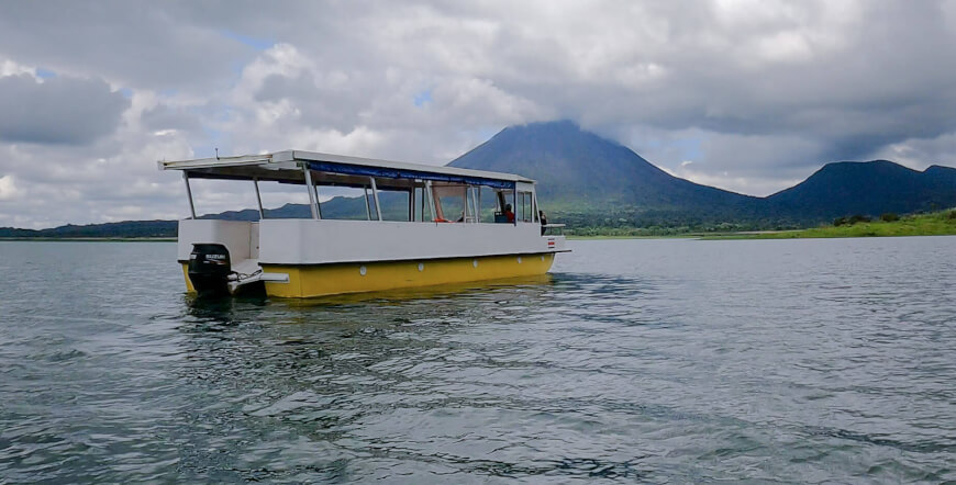 Since there's no permanent docking area due to the Arenal Lake being a manmade reservoir for a hydroelectric project, deboarding can be a bit challenging. The path to the van for the next leg of your journey may be muddy or slippery. Rest assured, your driver and captain will assist with your luggage.